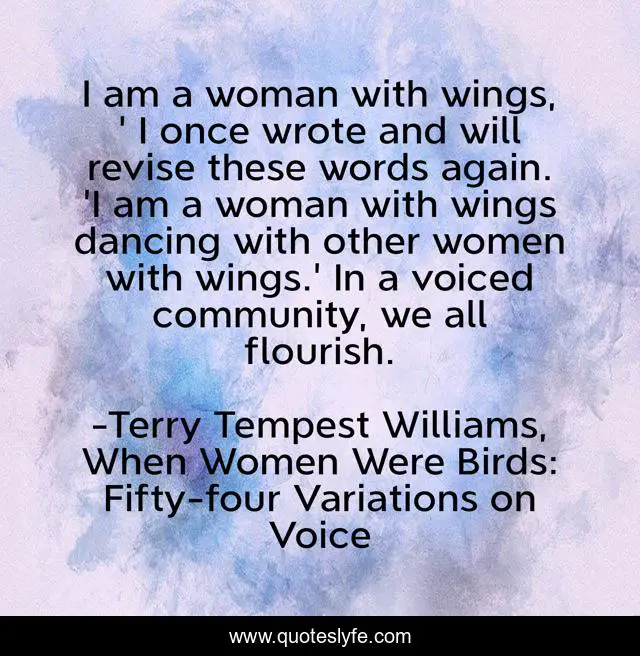 "Terry Tempest Williams, When Women Were Birds: Fifty-four Variations on Voice Quotes." Quoteslyfe.com, 2025. Sat. 06 Dec. 2025. <https://www.quoteslyfe.com/quote/I-am-a-woman-with-wings-I-59272>.