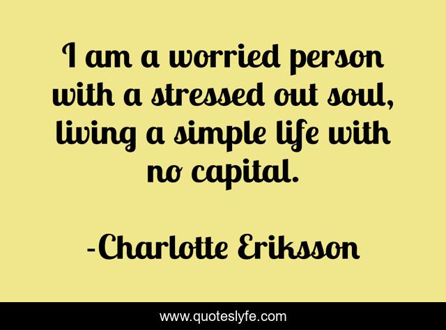 This page presents the quote "I am a worried person with a stressed out soul, living a simple life with no capital.". Author of this quote is Charlotte Eriksson. This quote is about living, life, the-glass-child, wanderer, minimalist, songwriter, quote, writer, character,.