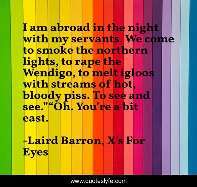 This page presents the quote "I am abroad in the night with my servants. We come to smoke the northern lights, to rape the Wendigo, to melt igloos with streams of hot, bloody piss. To see and see.”“Oh. You’re a bit east.". Author of this quote is Laird Barron, X's For Eyes. .