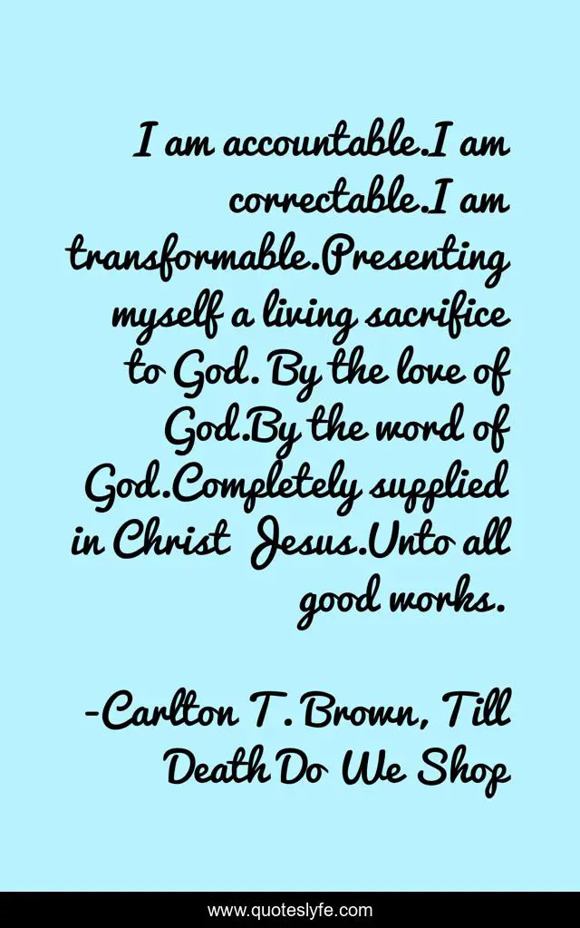 This page presents the quote "I am accountable.I am correctable.I am transformable.Presenting myself a living sacrifice to God. By the love of God.By the word of God.Completely supplied in Christ Jesus.Unto all good works.". Author of this quote is Carlton T. Brown, Till Death Do We Shop. This quote is about religion, christianity, enthusiasm, inspirational, church,.