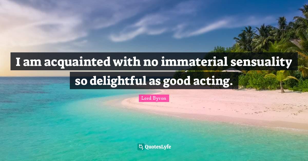 This page presents the quote "I am acquainted with no immaterial sensuality so delightful as good acting.". Author of this quote is Lord Byron. This quote is about good acting, sensual, delightful, acting, actors, sensuality,.