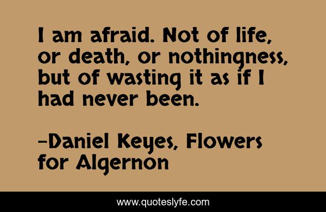 This page presents the quote "I am afraid. Not of life, or death, or nothingness, but of wasting it as if I had never been.". Author of this quote is Daniel Keyes, Flowers for Algernon. This quote is about fear, death, life,.