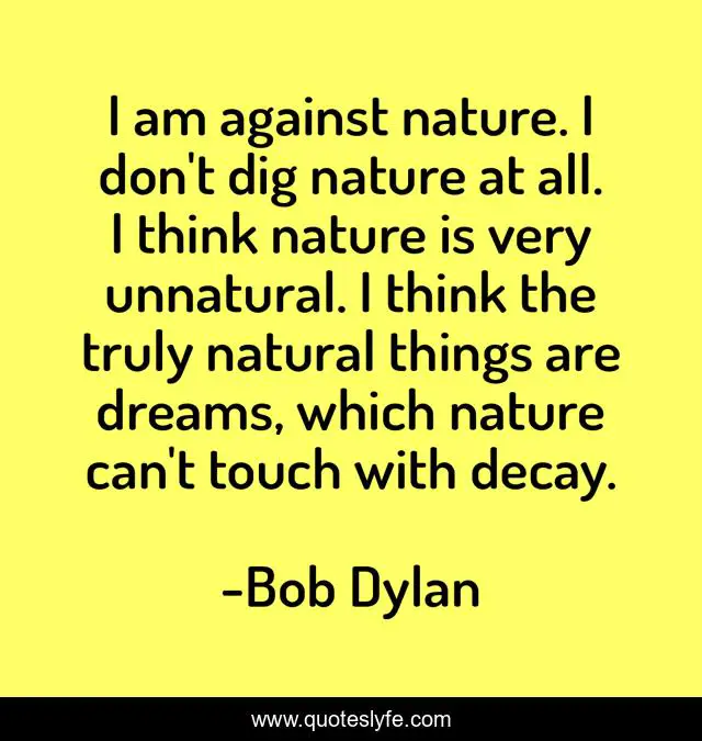 This page presents the quote "I am against nature. I don't dig nature at all. I think nature is very unnatural. I think the truly natural things are dreams, which nature can't touch with decay.". Author of this quote is Bob Dylan. This quote is about think, nature,.