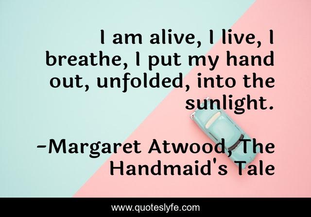 This page presents the quote "I am alive, I live, I breathe, I put my hand out, unfolded, into the sunlight.". Author of this quote is Margaret Atwood, The Handmaid's Tale. This quote is about sun, life, dystopia, nature,.