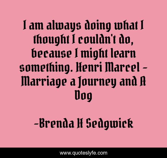 This page presents the quote "I am always doing what I thought I couldn't do, because I might learn something. Henri Marcel - Marriage a Journey and A Dog". Author of this quote is Brenda H Sedgwick. This quote is about comedy-humor, contemporary-romance,.
