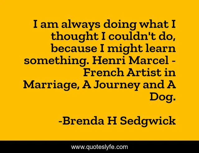This page presents the quote "I am always doing what I thought I couldn't do, because I might learn something. Henri Marcel - French Artist in Marriage, A Journey and A Dog.". Author of this quote is Brenda H Sedgwick. This quote is about comedy, romance-contemporary,.