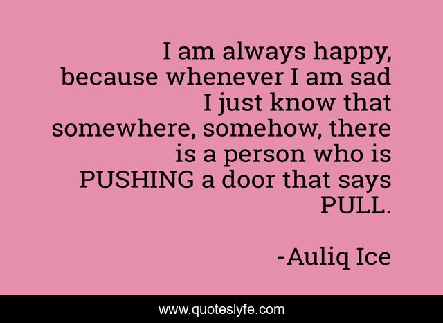 This page presents the quote "I am always happy, because whenever I am sad I just know that somewhere, somehow, there is a person who is PUSHING a door that says PULL.". Author of this quote is Auliq Ice. This quote is about funny, being-happy, humor, self-happiness, cheering-up, comedy,.