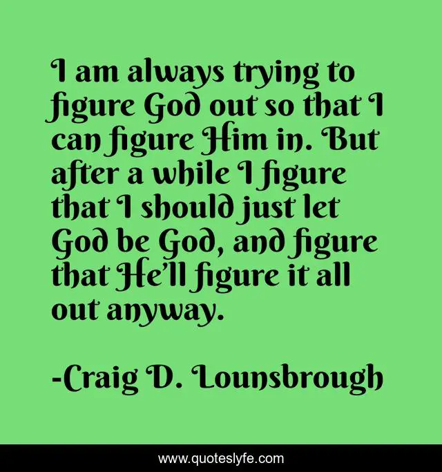 This page presents the quote "I am always trying to figure God out so that I can figure Him in. But after a while I figure that I should just let God be God, and figure that He’ll figure it all out anyway.". Author of this quote is Craig D. Lounsbrough. This quote is about bible, christian, relationship, space, god, role, figure-out, solution, christianity,.