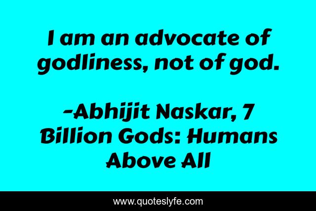 This page presents the quote "I am an advocate of godliness, not of god.". Author of this quote is Abhijit Naskar, 7 Billion Gods: Humans Above All. This quote is about brainy, god, humanitarian, humanism, sage, inner-divinity, inspirational, enthusiasm, godliness,.