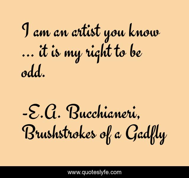 This page presents the quote "I am an artist you know ... it is my right to be odd.". Author of this quote is E.A. Bucchianeri, Brushstrokes of a Gadfly. This quote is about funny, odd-people, art, humour, artist, eccentric, creativity, gadfly, artsy,.