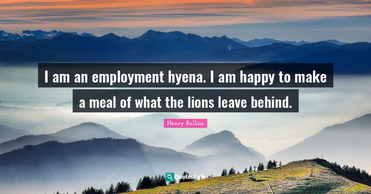 This page presents the quote "I am an employment hyena. I am happy to make a meal of what the lions leave behind.". Author of this quote is Henry Rollins. This quote is about meals, happy, lions, employment,.