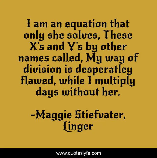 This page presents the quote "I am an equation that only she solves, These X's and Y's by other names called, My way of division is desperatley flawed, while I multiply days without her.". Author of this quote is Maggie Stiefvater, Linger. This quote is about romance, wolves, maggie-stiefvater, love, affection,.
