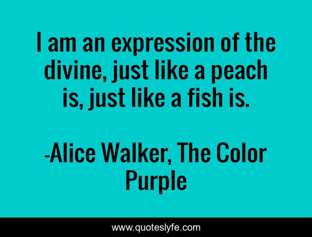 This page presents the quote "I am an expression of the divine, just like a peach is, just like a fish is.". Author of this quote is Alice Walker, The Color Purple. This quote is about peaches, fish, divine,.