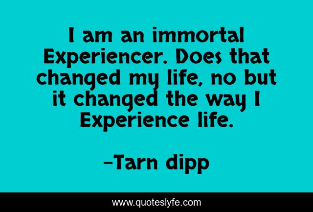 This page presents the quote "I am an immortal Experiencer. Does that changed my life, no but it changed the way I Experience life.". Author of this quote is Tarn dipp. This quote is about life, lovers, enlightnment, joy, sad, health, anger, bliss,.