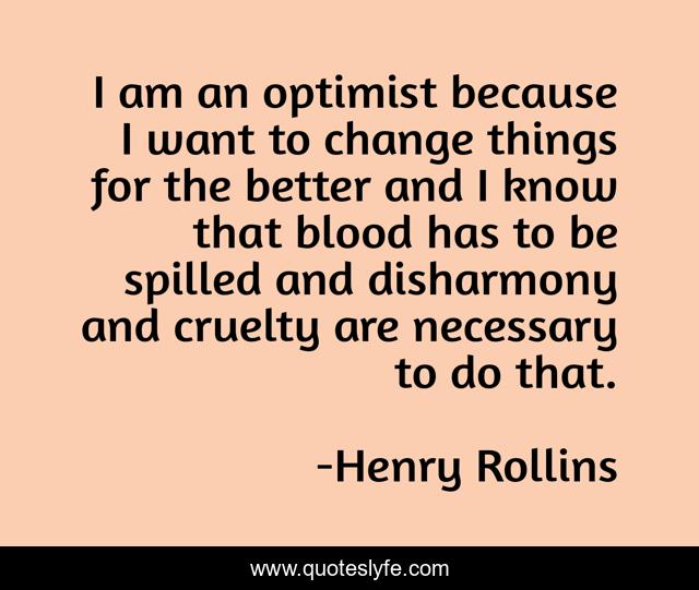 This page presents the quote "I am an optimist because I want to change things for the better and I know that blood has to be spilled and disharmony and cruelty are necessary to do that.". Author of this quote is Henry Rollins. .