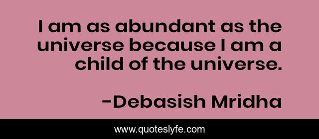 This page presents the quote "I am as abundant as the universe because I am a child of the universe.". Author of this quote is Debasish Mridha. This quote is about child-of-the-universe, abundant-as-the-universe, universe, philosophy, debasish-mridha, quotes, debasish-mridha-md, inspirational, enthusiasm,.