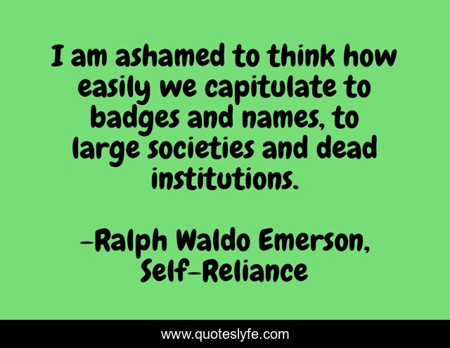 This page presents the quote "I am ashamed to think how easily we capitulate to badges and names, to large societies and dead institutions.". Author of this quote is Ralph Waldo Emerson, Self-Reliance. This quote is about appearances, labels, values, institutions,.