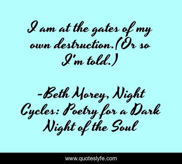 This page presents the quote "I am at the gates of my own destruction.(Or so I'm told.)". Author of this quote is Beth Morey, Night Cycles: Poetry for a Dark Night of the Soul. This quote is about faith, poem, god, poetry, spirituality, doubt,.