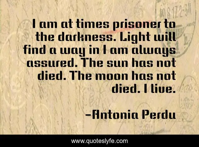 This page presents the quote "I am at times prisoner to the darkness. Light will find a way in I am always assured. The sun has not died. The moon has not died. I live.". Author of this quote is Antonia Perdu. This quote is about die, live, darkness,.