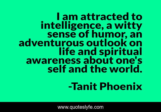 This page presents the quote "I am attracted to intelligence, a witty sense of humor, an adventurous outlook on life and spiritual awareness about one's self and the world.". Author of this quote is Tanit Phoenix. This quote is about intelligence, life,.