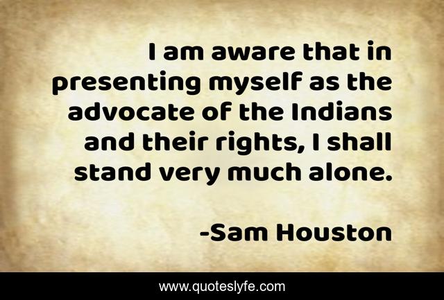 This page presents the quote "I am aware that in presenting myself as the advocate of the Indians and their rights, I shall stand very much alone.". Author of this quote is Sam Houston. This quote is about myself, stand,.