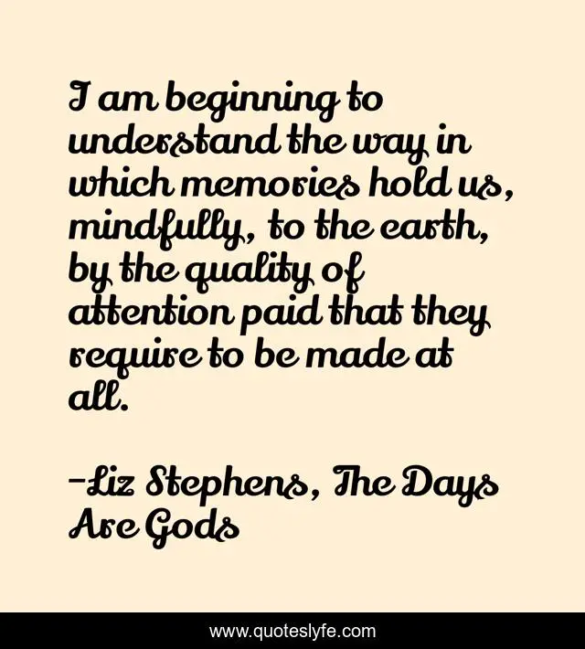 This page presents the quote "I am beginning to understand the way in which memories hold us, mindfully, to the earth, by the quality of attention paid that they require to be made at all.". Author of this quote is Liz Stephens, The Days Are Gods. .