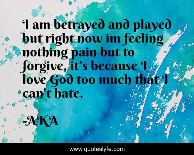 This page presents the quote "I am betrayed and played but right now im feeling nothing pain but to forgive, it's because I love God too much that I can't hate.". Author of this quote is AKA. This quote is about pain, played, god, betrayal, feelings, forgiveness,.