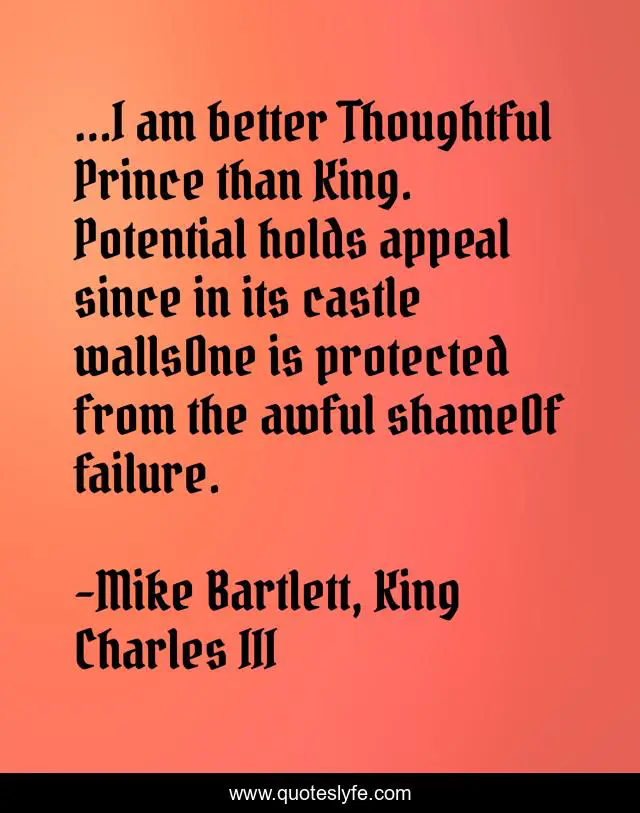This page presents the quote "...I am better Thoughtful Prince than King. Potential holds appeal since in its castle wallsOne is protected from the awful shameOf failure.". Author of this quote is Mike Bartlett, King Charles III. This quote is about failure, contemplative,.
