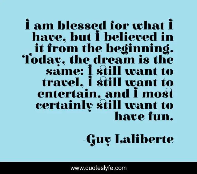 This page presents the quote "I am blessed for what I have, but I believed in it from the beginning. Today, the dream is the same: I still want to travel, I still want to entertain, and I most certainly still want to have fun.". Author of this quote is Guy Laliberte. This quote is about blessed, today,.