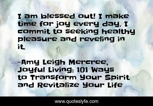 This page presents the quote "I am blessed out! I make time for joy every day. I commit to seeking healthy pleasure and reveling in it.". Author of this quote is Amy Leigh Mercree, Joyful Living: 101 Ways to Transform Your Spirit and Revitalize Your Life. This quote is about life, quotes-de-la-vida, amy-leigh-mercree, blessed-life, joy, quote-about-life, joyful-living, blessings, joyful-living-101,.