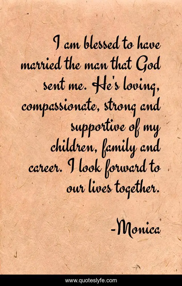 This page presents the quote "I am blessed to have married the man that God sent me. He's loving, compassionate, strong and supportive of my children, family and career. I look forward to our lives together.". Author of this quote is Monica. This quote is about god, strong, children,.