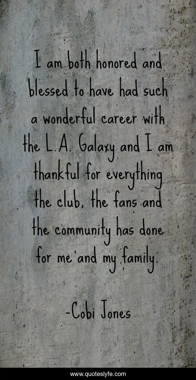 This page presents the quote "I am both honored and blessed to have had such a wonderful career with the L.A. Galaxy and I am thankful for everything the club, the fans and the community has done for me and my family.". Author of this quote is Cobi Jones. This quote is about family, community,.