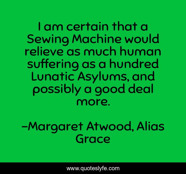 This page presents the quote "I am certain that a Sewing Machine would relieve as much human suffering as a hundred Lunatic Asylums, and possibly a good deal more.". Author of this quote is Margaret Atwood, Alias Grace. This quote is about sewing, technology, innovation,.