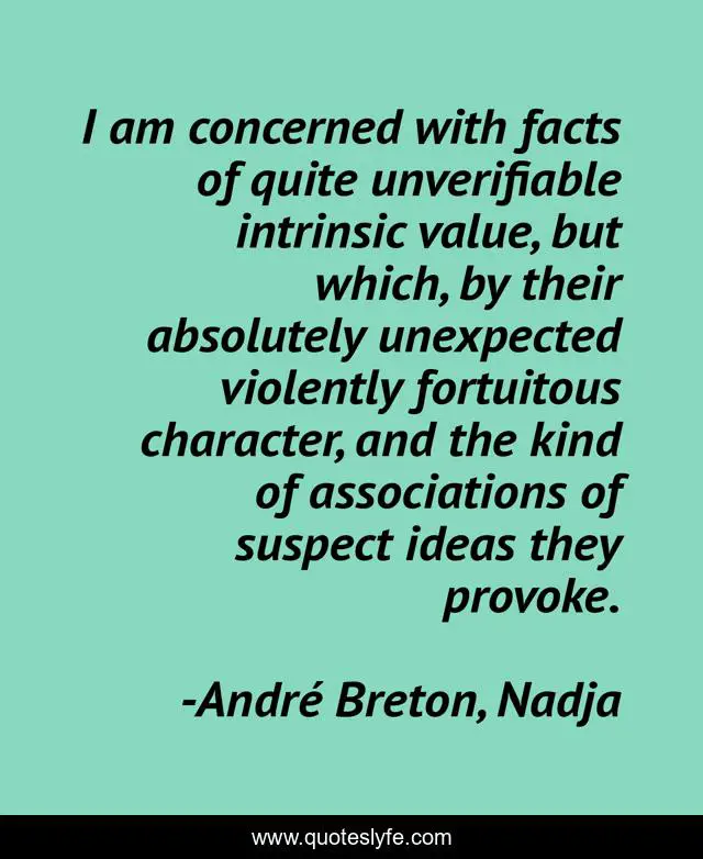 This page presents the quote "I am concerned with facts of quite unverifiable intrinsic value, but which, by their absolutely unexpected violently fortuitous character, and the kind of associations of suspect ideas they provoke.". Author of this quote is André Breton, Nadja. This quote is about facts, impressions,.