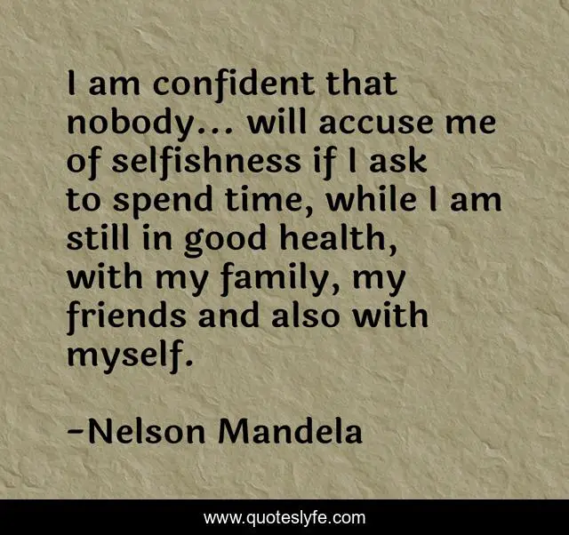 This page presents the quote "I am confident that nobody... will accuse me of selfishness if I ask to spend time, while I am still in good health, with my family, my friends and also with myself.". Author of this quote is Nelson Mandela. This quote is about friends, health, time,.
