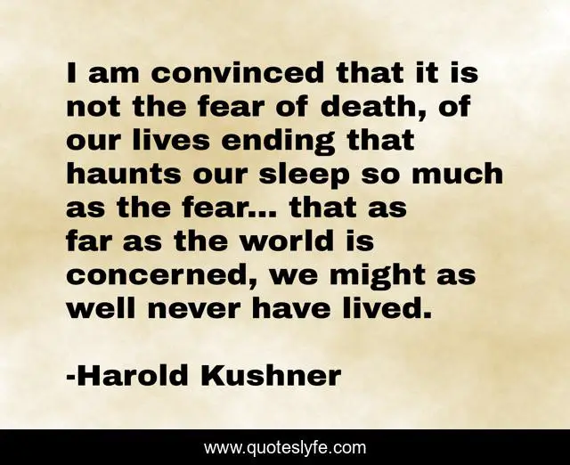 This page presents the quote "I am convinced that it is not the fear of death, of our lives ending that haunts our sleep so much as the fear... that as far as the world is concerned, we might as well never have lived.". Author of this quote is Harold Kushner. This quote is about death, sleep,.