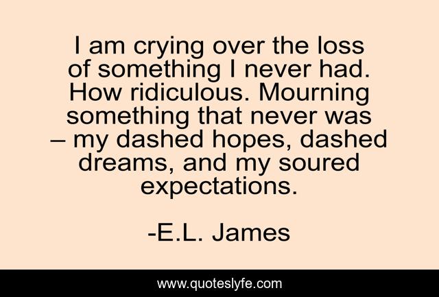 This page presents the quote "I am crying over the loss of something I never had. How ridiculous. Mourning something that never was – my dashed hopes, dashed dreams, and my soured expectations.". Author of this quote is E.L. James. This quote is about pain, rejection,.