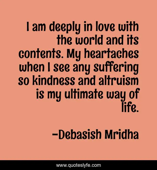 This page presents the quote "I am deeply in love with the world and its contents. My heartaches when I see any suffering so kindness and altruism is my ultimate way of life.". Author of this quote is Debasish Mridha. This quote is about miraboli, when-i-see-suffering, inspirational, oscar-wilde, philosophy, debasish-mridha, tagore, quotes, buddha,.