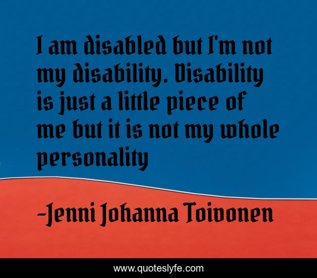 This page presents the quote "I am disabled but I'm not my disability. Disability is just a little piece of me but it is not my whole personality". Author of this quote is Jenni Johanna Toivonen. This quote is about disability, chronic-illness, health, disability-awareness, life-philosophy,.