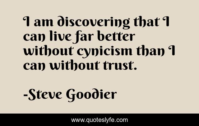 This page presents the quote "I am discovering that I can live far better without cynicism than I can without trust.". Author of this quote is Steve Goodier. This quote is about cynical, depending, trusting, cynicism, trust, trustworthiness,.