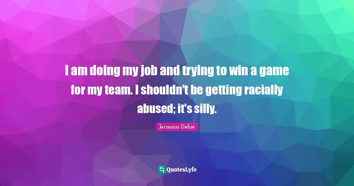 This page presents the quote "I am doing my job and trying to win a game for my team. I shouldn't be getting racially abused; it's silly.". Author of this quote is Jermain Defoe. This quote is about team, trying, jobs, silly,.