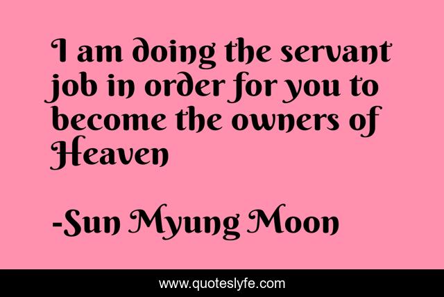 This page presents the quote "I am doing the servant job in order for you to become the owners of Heaven". Author of this quote is Sun Myung Moon. This quote is about servant, religion, heaven, inspirational, enthusiasm,.