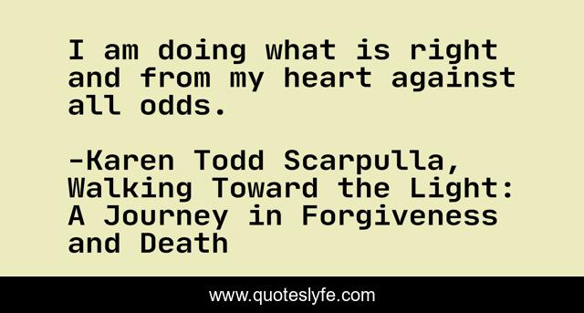This page presents the quote "I am doing what is right and from my heart against all odds.". Author of this quote is Karen Todd Scarpulla, Walking Toward the Light: A Journey in Forgiveness and Death. This quote is about strength, love, courage, forgiveness, affection, inspiration,.