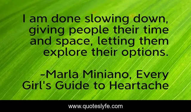 This page presents the quote "I am done slowing down, giving people their time and space, letting them explore their options.". Author of this quote is Marla Miniano, Every Girl's Guide to Heartache. .