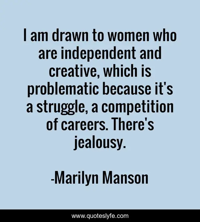 This page presents the quote "I am drawn to women who are independent and creative, which is problematic because it's a struggle, a competition of careers. There's jealousy.". Author of this quote is Marilyn Manson. This quote is about struggle, women,.