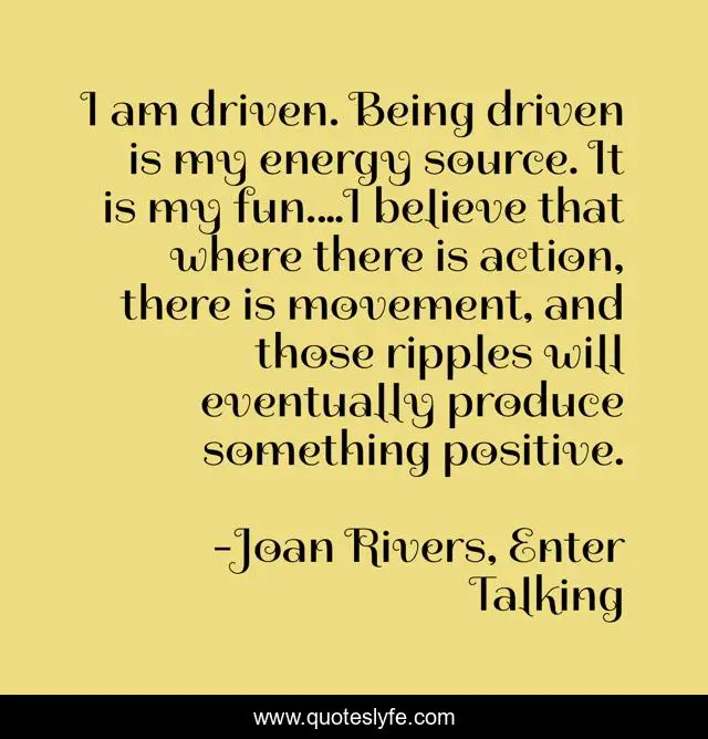 This page presents the quote "I am driven. Being driven is my energy source. It is my fun.…I believe that where there is action, there is movement, and those ripples will eventually produce something positive.". Author of this quote is Joan Rivers, Enter Talking. This quote is about humour, performers, writing, brooklyn, nyc, comedy,.