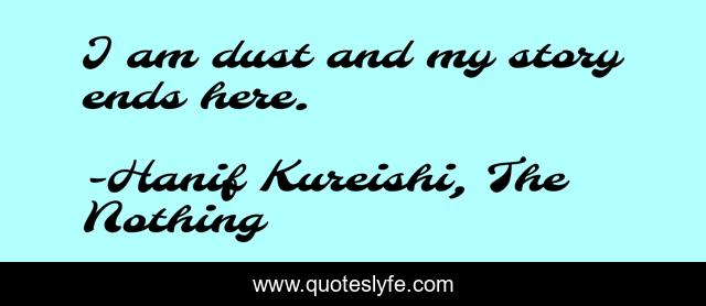 This page presents the quote "I am dust and my story ends here.". Author of this quote is Hanif Kureishi, The Nothing. This quote is about dust, ends, story,.