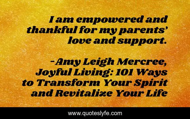 This page presents the quote "I am empowered and thankful for my parents’ love and support.". Author of this quote is Amy Leigh Mercree, Joyful Living: 101 Ways to Transform Your Spirit and Revitalize Your Life. This quote is about life, quotes-de-la-vida, amy-leigh-mercree, family, quote-of-the-day, quotes-for-instagram, parental-love, joyful-living, quotes-tumblr,.