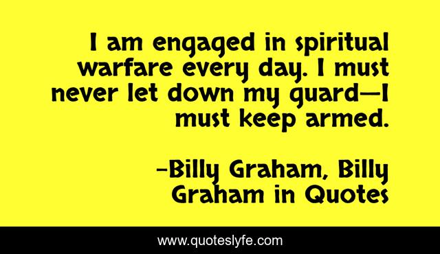 This page presents the quote "I am engaged in spiritual warfare every day. I must never let down my guard—I must keep armed.". Author of this quote is Billy Graham, Billy Graham in Quotes. This quote is about christian-life, billy-graham,.