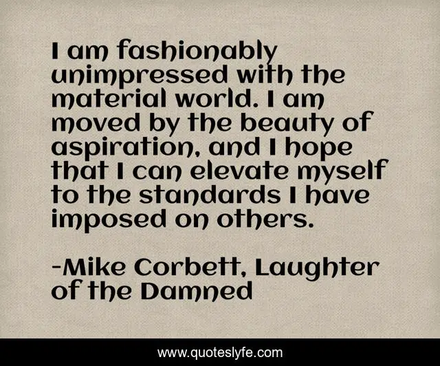 This page presents the quote "I am fashionably unimpressed with the material world. I am moved by the beauty of aspiration, and I hope that I can elevate myself to the standards I have imposed on others.". Author of this quote is Mike Corbett, Laughter of the Damned. This quote is about heaven, afterlife, satire, demons, religion, satan, politics, intelligent-humor, hell,.